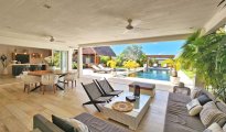 The entire living space seamlessly opens onto a beautiful terrace, where you can step out and enjoy views of your own private swimming pool and lush tropical garden. The villa comfortably accommodates up to 8 adults and 1 child (under 3 years old). An extra mattress can be added for a ninth person for an additional fee.
