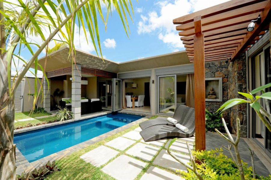 Exterior: Villas are designed with private garden areas, outdoor seating, and parking. Likely built with local materials and architectural styles common in Mauritius.