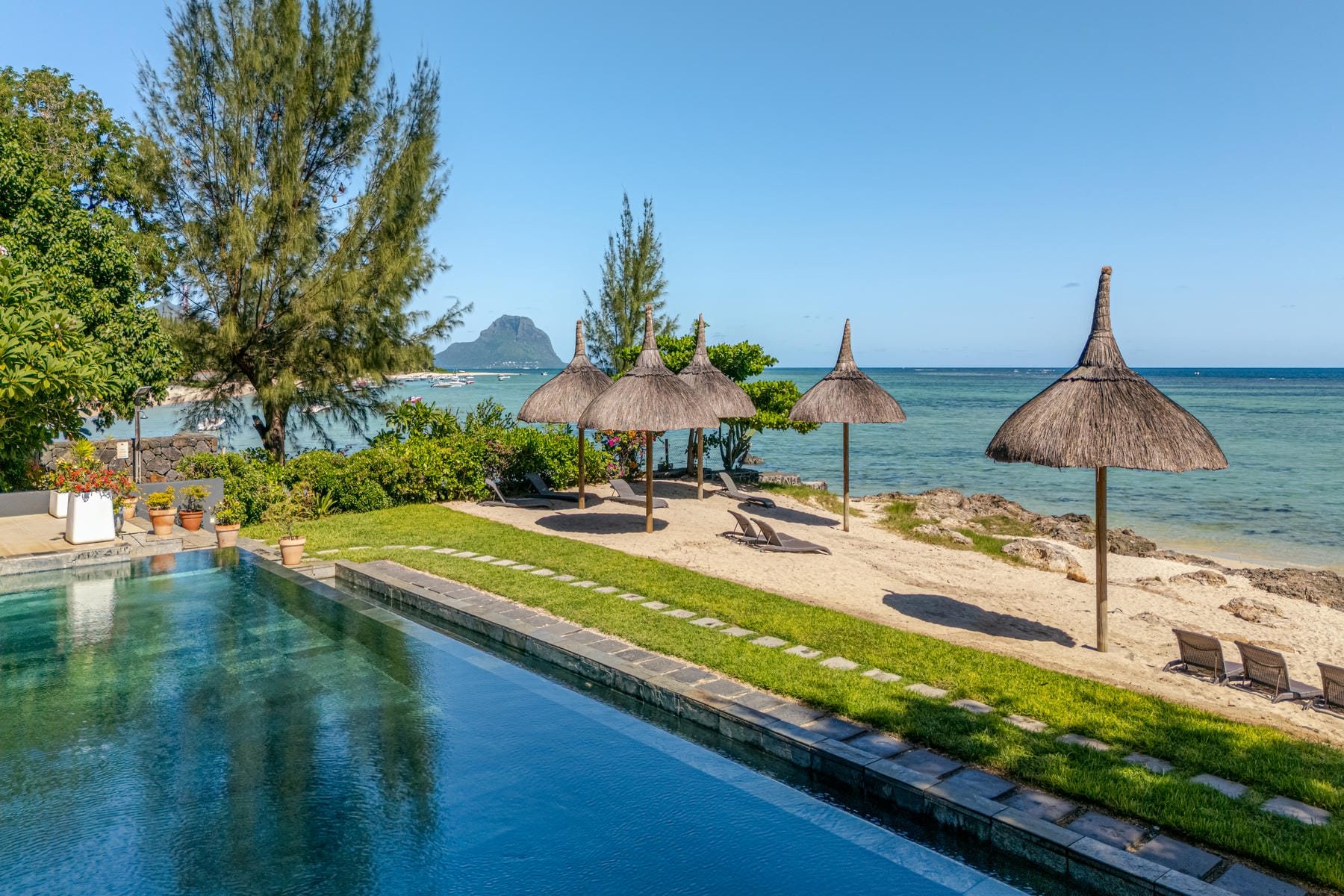 Located on the white sand beach of Tamarin, with panoramic views of the Le Morne Mountain and Indian Ocean, the Premium Apartments of Esplanade offer a splendid beach and garden views from the living room. The apartments are located on the ground floor and the first floor and consist of 3 bedrooms, an open plan kitchen and a bright living area. The units are air-conditioned and have wifi connectivity. There is a common swimming pool and sun loungers for your comfort. The neighbouring area is vibrant with local authentic shops and restaurants.
