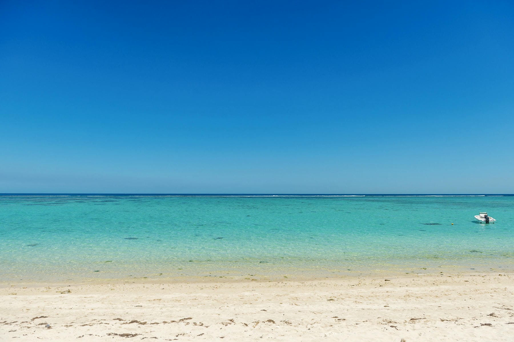 Beach in front of Cap Ouest: Direct access to sandy beach, ideal for swimming, sunbathing, and relaxation in calm waters.: