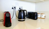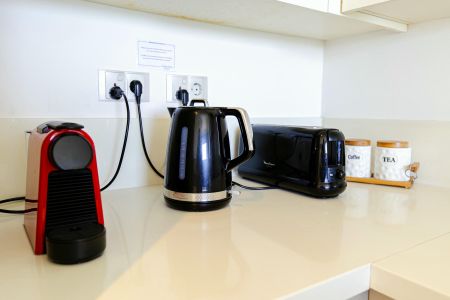 Kitchen Essentials: A bottle of water, tea, coffee, milk, butter, jam, bread, olive oil, cider vinegar, salt, sugar, and pepper.